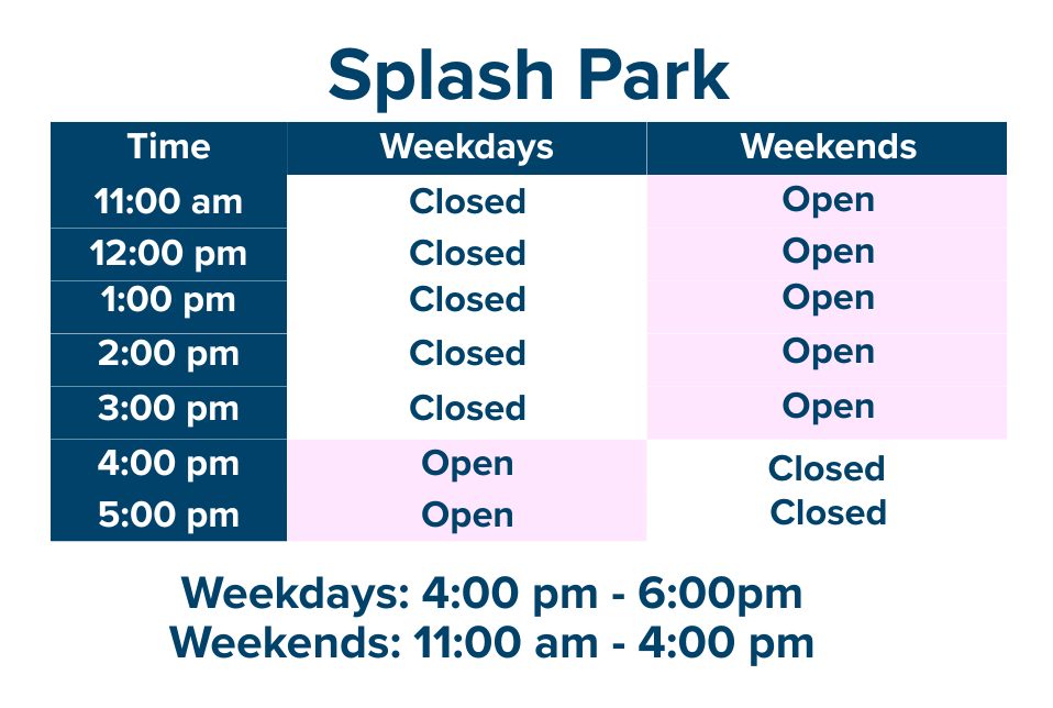 Please note that the Splash Park is subject to closure if there is a shortage in lifeguards