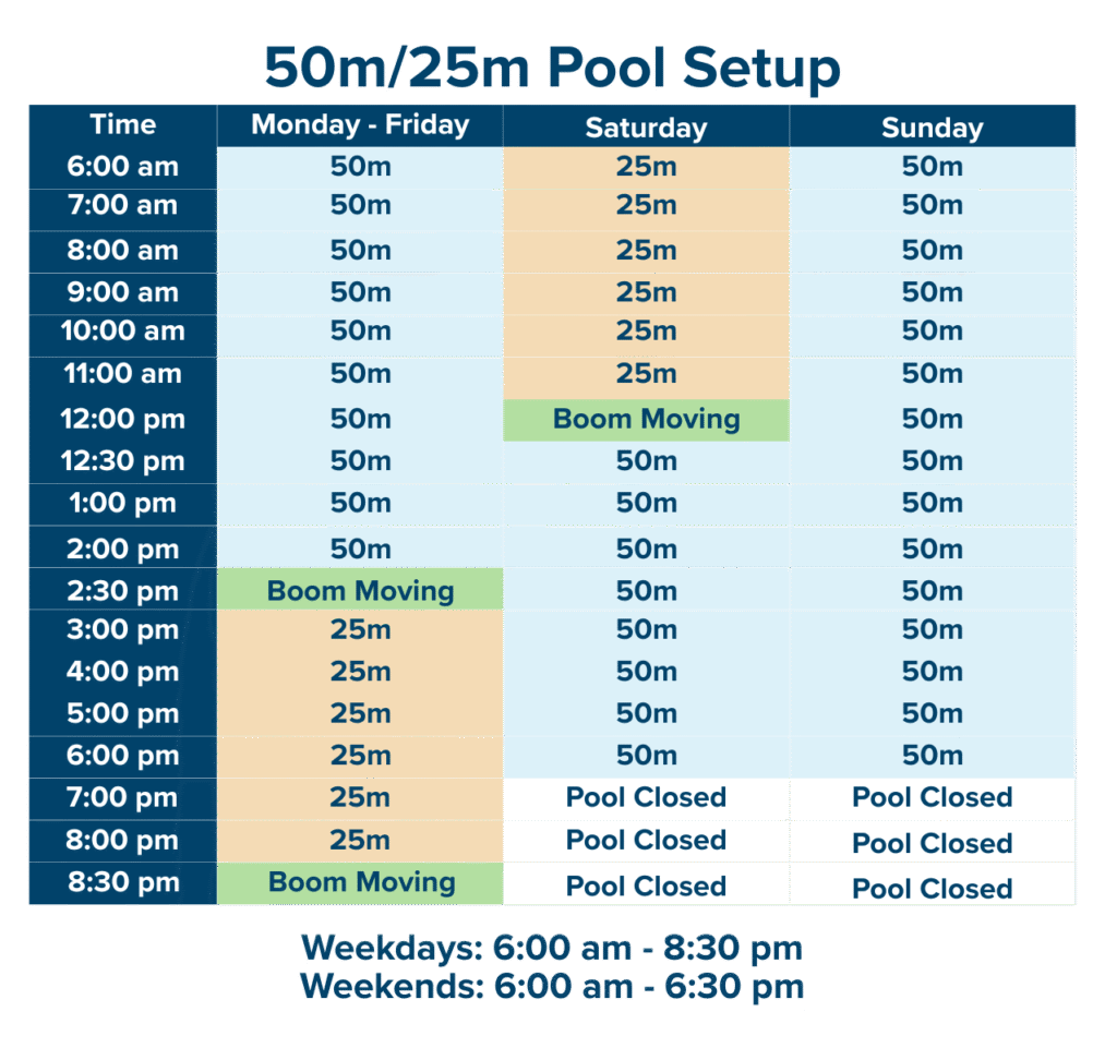 Our 50m pool features a movable boom that allows us to convert the pool into two 25m pools. The boom will be moved at set times each day to accommodate our bookings and programs, during these times no patrons will be allowed in the water, we ask for your patience and understanding.